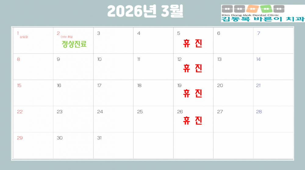 2026년 3월 진료안내입니다. 페이지 정보 작성자 김동목바른이치과 작성일26-02-23 14:21 조회10회 댓글0건 관련링크 다음글 목록 본문 2026년 3월 진료안내입니다. 댓글목록 등록된 댓글이 없습니다. 다음글 목록