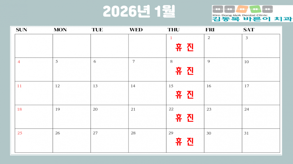 2026년 1월 진료안내입니다. 페이지 정보 작성자 김동목바른이치과 작성일25-12-20 09:26 조회10회 댓글0건 관련링크 다음글 목록 본문 2026년 1월 진료안내입니다. 댓글목록 등록된 댓글이 없습니다. 다음글 목록